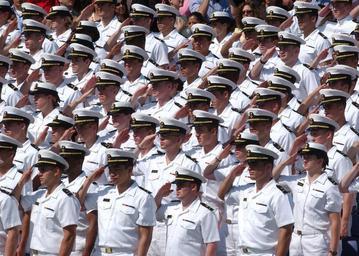 | Keywords: US Navy 050527-N-1026O-057 Underclassmen salute the colors during the National Anthem at the opening of the 2005 Naval Academy Graduation Ceremony.jpg en Annapolis Md May 27 2005 Underclassmen salute the colors during the National Anthem at the opening of the 2005 Naval Academy Graduation Ceremony at the Navy Marine Corps Memorial Stadium President George W Bush delivered the commencement address and personally greeted each graduate during the ceremony The men and women of the graduating class were sworn into the Navy as ensigns or into the Marine Corps as 2nd lieutenants U S Navy photo by Shannon O'Connor RELEASED 2005-05-27 050527-N-1026O-057 Navy http //www navy mil/view_image asp id 24989 U S Navy photo by Shannon O'Connor PD-USGov-Military-Navy Graduation and Commissioning Ceremony May 27 2005 |
