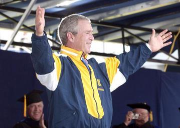| Keywords: US Navy 050527-N-5390M-206 U.S. President George W. Bush tries on a Naval Academy windbreaker presented to him by a graduating Midshipman during the 2005 Naval Academy Graduation Ceremony.jpg en Annapolis Md May 27 2005 U S President George W Bush tries on a Naval Academy windbreaker presented to him by a graduating Midshipman during the 2005 Naval Academy Graduation Ceremony at the Navy Marine Corps Memorial Stadium President George W Bush delivered the commencement address and personally greeted each graduate during the ceremony The men and women of the graduating class were sworn into the Navy as ensigns or into the Marine Corps as 2nd lieutenants U S Navy photo by Ken Mierzejewski RELEASED 2005-05-27 050527-N-5390M-206 Navy http //www navy mil/view_image asp id 24991 U S Navy photo by Ken Mierzejewski PD-USGov-Military-Navy George W Bush in 2005 Jackets Graduation and Commissioning Ceremony May 27 2005 |