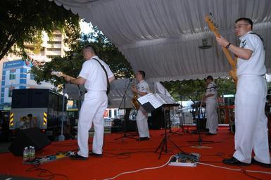 | Keywords: US Navy 050603-N-0493B-002 The Seventh Fleet Band performs at the Singapore Street Festival.jpg en Singapore June 3 2005 - The Seventh Fleet Band Orient Express performs at the Singapore Street Festival The band is in Singapore taking part in exercise Cooperation Afloat Readiness and Training CARAT 2005 with the Republic of Singapore Navy CARAT is a regularly scheduled series of bilateral military exercises with various Southeast Asian nations designed to enhance interoperability of the respective sea services and includes a variety of operational social and community events U S Navy photo by Lt Chuck Bell RELEASED 2005-06-03 050603-N-0493B-002 Navy http //www navy mil/view_image asp id 25048 U S Navy photo by Lt Chuck Bell PD-USGov-Military-Navy Naval ships of the United States in Singapore |