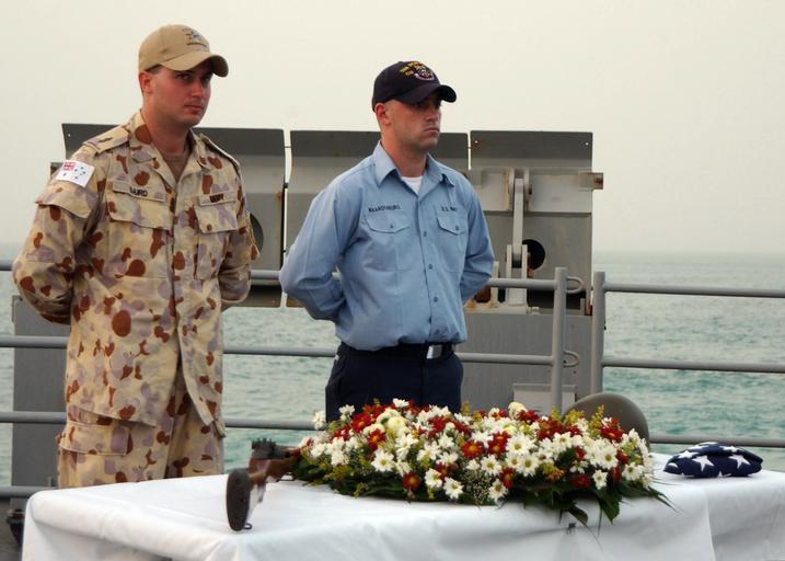 Keywords: US Navy 050606-N-1825E-099 U.S. and Royal Australian Navy (RAN) Sailors aboard the guided missile cruiser USS Normandy (CG 60), stand side-by-side to honor World War II D-Day veterans during an early evening memorial ceremony.jpg en Persian Gulf June 6 2005 - U S and Royal Australian Navy RAN Sailors aboard the guided missile cruiser USS Normandy CG 60 stand side-by-side to honor World War II D-Day veterans during an early evening memorial ceremony The hour-long service marked the 61st anniversary of coalition allies storming the beaches of Normandy France June 6 1944 The crew gathered on the fantail of the ship and listened to words of remembrance from the commanding officer and from family members of those who took part in D-Day invasion The Commander Task Force Five Eight CTF-58 flagship is conducting maritime security operations MSO in the region MSO sets the conditions for security and stability in the maritime environment U S Navy photo by Journalist 3rd Class Joseph Ebalo RELEASED 2005-06-06 050606-N-1825E-099 Navy http //www navy mil/view_image asp id 25153 U S Navy photo by Journalist 3rd Class Joseph Ebalo PD-USGov-Military-Navy Aboard USS Normandy CG-60 Royal Australian Navy D-Day anniversaries |