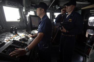 | Keywords: US Navy 050613-N-4309A-083 Hospital Corpsman 1st class Roy Pinedo stands the conning watch as officer of the deck as Lt. j.g. Chris Wolff communicates with coastal patrol craft USS Chinook (PC 9) in the waters off Iraq.jpg en North Persian Gulf June 13 2005 - Hospital Corpsman 1st class Roy Pinedo stands the conning watch as officer of the deck as Lt j g Chris Wolff communicates with coastal patrol craft USS Chinook PC 9 in the waters off Iraq Chinook is currently conducting Maritime Security Operations MSO MSO sets the condition for security and stability in the maritime environment complementing the counter-terrorism and security efforts of regional nations MSO also denies international terrorists use of the maritime environment as a venue for attack or to transport personnel weapons or other material U S Navy photo by Photographer's Mate 1st Class Aaron Ansarov RELEASED 2005-06-13 050613-N-4309A-083 Navy http //www navy mil/view_image asp id 25568 U S Navy photo by Photographer's Mate 1st Class Aaron Ansarov PD-USGov-Military-Navy Images from US Navy location North Persian Gulf |
