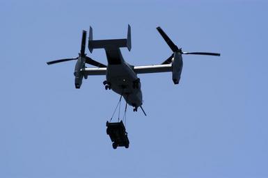 | Keywords: US Navy 050616-N-8154G-025 An MV-22 Osprey assigned to Marine Tilt-Rotor Operational Test and Evaluation Squadron Two Two transports a hummer.jpg en Atlantic Ocean June 16 2005 - An MV-22 Osprey assigned to the Argonauts of Marine Tilt-Rotor Operational Test and Evaluation Squadron Two Two VMX-22 transports a hummer from the flight deck of USS Bataan LHD 5 to shore as part of a training exercise The MV-22 is conducting training operations with Marines assigned to 1st Battalion 8th Marine Regiment Platoon 1/8 currently embarked aboard the amphibious assault ship USS Bataan LHD 5 Bataan is currently underway in the Atlantic Ocean completing the final test and evaluation for the MV-22 Osprey tilt-rotor aircraft U S Navy photo by Photographer's Mate Airman Jeremy L Grisham RELEASED 2005-06-16 050616-N-8154G-025 Navy http //www navy mil/view_image asp id 25379 U S Navy photo by Photographer's Mate Airman Jeremy L Grisham PD-USGov-Military-Navy MV-22B Osprey USMC in hovering Humvees in United States service Helihoisting of automobiles VMX-22 |