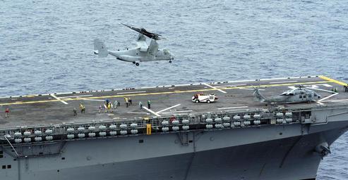 | Keywords: US Navy 050618-N-8154G-091 An MV-22 Osprey, assigned to Marine Tiltrotor Operational Test and Evaluation Squadron Two Two (VMX-22), takes off from the flight deck of the amphibious assault ship USS Bataan (LHD 5).jpg en Atlantic Ocean June 18 2005 - An MV-22 Osprey assigned to Marine Tiltrotor Operational Test and Evaluation Squadron Two Two VMX-22 takes off from the flight deck of the amphibious assault ship USS Bataan LHD 5 VMX-22 is conducting the final operational test phase of the tiltrotor aircraft The MV-22 is an advanced technology vertical/short takeoff and landing VSTOL multipurpose tactical aircraft and is scheduled to replace aging CH-46E Sea Knight and CH-53D Sea Stallion helicopters currently in service U S Navy photo by Photographer's Mate Airman Jeremy L Grisham RELEASED 2005-06-18 050618-N-8154G-091 Navy http //www navy mil/view_image asp id 25449 U S Navy photo by Photographer's Mate Airman Jeremy L Grisham PD-USGov-Military-Navy Aboard USS Bataan LHD-5 MV-22B Osprey USMC in hovering VMX-22 |