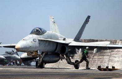| Keywords: US Navy 050625-N-7265L-012 A member of the waist catapult crew moves to a safe location after installing the holdback bar into the catapult shuttle in preparation for the launch of an F-A-18C Hornet.jpg en USS Carl Vinson June 25 2005 - A member of the waist catapult crew moves to a safe location after installing the holdback bar into the catapult shuttle in preparation for the launch of an F/A-18C Hornet assigned to the Argonauts of Strike Fighter Squadron One Four Seven VFA-147 on the flight deck aboard the Nimitz-class aircraft carrier USS Carl Vinson CVN 70 The Carl Vinson Carrier Strike Group is currently deployed to the Persian Gulf conducting operations in support of multi-national forces in Iraq Vinson will end its deployment with a homeport shift to Norfolk Va and commence a three-year refuel and complex overhaul U S Navy Photo by Photographer's Mate 2nd Class Inez Lawson RELEASED 2005-06-25 050625-N-7265L-012 Navy http //www navy mil/view_image asp id 25650 U S Navy Photo by Photographer's Mate 2nd Class Inez Lawson PD-USGov-Military-Navy Aboard USS Carl Vinson CVN-70 Strike Fighter Squadron 147 United States Navy |