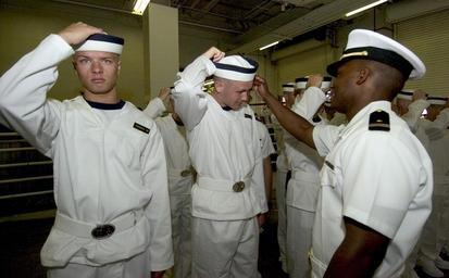 | Keywords: US Navy 050629-N-9693M-252 Midshipman 1st Class Kasisi Harris, right, instructs a Midshipman candidate on the proper wearing of his cover at the United States Naval Academy in Annapolis, Md.jpg en Annapolis Md June 29 2005 - Midshipman 1st Class Kasisi Harris right instructs a Midshipman candidate on the proper wearing of his cover at the United States Naval Academy in Annapolis Md Approximately 1200 prospective Midshipmen 4th Class Plebes reported to the Academy for Induction into the class of 2009 and the first day of Plebe summer The Plebes were cycled through a series of stations to establish medical and dental records receive uniforms complete paperwork and receive their military haircut U S Navy photo by Mr Damon J Moritz RELEASED 2005-06-29 050629-N-9693M-252 Navy http //www navy mil/view_image asp id 25764 U S Navy photo by Mr Damon J Moritz PD-USGov-Military-Navy United States Naval Academy Induction Day Sailor suits Sailor caps of the United States Navy |