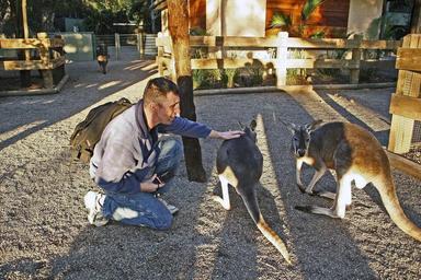 | Keywords: US Navy 050704-N-6009S-002 Engineman 1st Class Kevin Kesler, pats kangaroos living at the Featherdale Zoo while on a USS Kitty Hawk (CV 63) Morale, Welfare and Recreation (MWR) tour.jpg en Sydney Australia July 4 2005 - Engineman 1st Class Kevin Kesler pats kangaroos living at the Featherdale Zoo while on a USS Kitty Hawk CV 63 Morale Welfare and Recreation MWR tour The conventionally-powered Kitty Hawk embarked Carrier Air Wing Five CVW-5 and the guided missile cruiser USS Cowpens CG 63 arrived for a five-day port in Australia while conducting its summer cruise in the 7th Fleet area of responsibility AOR Kitty Hawk demonstrates power projection and sea control as the U S Navy's only permanently forward-deployed aircraft carrier operating from Yokosuka Japan U S Navy photo by Photographer's Mate 1st Class Hana'lei Shimana RELEASED 2005-07-04 050704-N-6009S-002 Navy http //www navy mil/view_image asp id 26041 U S Navy photo by Photographer's Mate 1st Class Hana'lei Shimana PD-USGov-Military-Navy Images from US Navy location Sydney Australia Aboard USS Cowpens CG-63 Engineman United States Navy Unidentified Macropus |