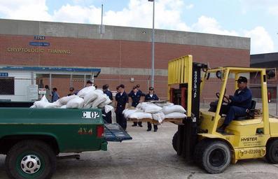 | Keywords: US Navy 050708-N-9246G-016 Cryptologic Technician 1st Class Henry Hughes unloads pallets of sand bags at the Center for Information Dominance, Corry Station, as awaiting Sailors prepare to place them around exterior doorways.jpg en Corry Station Pensacola Fla July 8 2005 Cryptologic Technician 1st Class Henry Hughes unloads pallets of sand bags at the Center for Information Dominance Corry Station as awaiting Sailors prepare to place them around exterior doorways in Bldg 3744 The secure building normally used for classified Cryptologic training is being converted to a hurricane shelter to potentially house several hundred military and civilian evacuees if Hurricane Dennis impacts the Pensacola Fla area as projected As of 8 a m EDT 1200 GMT Dennis a Category 4 hurricane was located 230 miles southeast of Havana Cuba and about 285 miles south-southeast of Key West Florida The storm is moving northwest at 12 mph but is expected to start moving west-northwest It is expected to make landfall Sunday The Atlantic hurricane season began June 1 and ends Nov 30 U S Navy photo by Darlene Goodwin RELEASED For more information visit <a href https //weather navy mil Target _BLANK >https //weather navy mil</a> 2005-07-08 050708-N-9246G-016 Navy http //www navy mil/view_image asp id 25986 U S Navy photo by Darlene Goodwin PD-USGov-Military-Navy Center for Information Dominance Corry Station Cryptologic Technician Hyster forklifts |