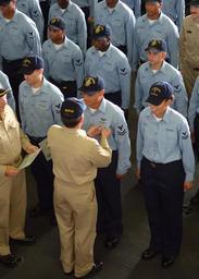 | Keywords: US Navy 050712-N-0962S-061 MCPON Terry Scott pins Enlisted Surface Warfare Specialist (ESWS) and Enlisted Aviation Warfare Specialist (EAWS) pins on nearly 50 Sailors.jpg en Persian Gulf July 12 2005 - Master Chief Petty Officer of the Navy MCPON Terry Scott pins Enlisted Surface Warfare Specialist ESWS and Enlisted Aviation Warfare Specialist EAWS pins on nearly 50 Sailors aboard the amphibious assault ship USS Kearsarge LHD 3 prior to an all hands call MCPON talked with Sailors about their changing and evolving missions in the Global War on Terror U S Navy photo by Journalist 1st Class Brandan W Schulze RELEASED 2005-07-12 050712-N-0962S-061 Navy http //www navy mil/view_image asp id 26149 U S Navy photo by Journalist 1st Class Brandan W Schulze PD-USGov-Military-Navy Aboard USS Kearsarge LHD-3 Terry D Scott |