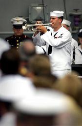 | Keywords: US Navy 050716-N-7730F-246 A lone bugler plays taps during a memorial service for retired Vice Adm. James B. Stockdale.jpg en San Diego July 16 2005 - A lone bugler plays taps during a memorial service for retired Vice Adm James B Stockdale during a memorial service held aboard the Nimitz-class aircraft carrier USS Ronald Reagan CVN 76 Hundreds of friends family members and shipmates gathered to remember the former prisoner of war and Congressional Medal of Honor recipient who died July 5 in Coronado Calif U S Navy photo by Photographer's Mate Airman Sarah Foster RELEASED 2005-07-16 050716-N-7730F-246 Navy http //www navy mil/view_image asp id 26286 U S Navy photo by Photographer's Mate Airman Sarah Foster PD-USGov-Military-Navy Funerals of military people in the United States James Stockdale Aboard USS Ronald Reagan CVN-76 Trumpet players from the United States Taps bugle call |