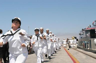 | Keywords: US Navy 050730-N-3672K-297 Sailors assigned to the Navy's newest Arleigh Burke-class destroyer, USS Halsey (DDG 96) run to man the ship as they bring the ship to life during the ship's commissioning ceremony.jpg en San Diego Calif July 30 2005 - Sailors assigned to the Navy's newest Arleigh Burke-class destroyer USS Halsey DDG 97 run to man the ship as they bring the ship to life during the ship's commissioning ceremony The ceremony marked the formal entrance of the guided missile destroyer into the fleet The ship was named after U S Naval Academy graduate Fleet Adm William Bull Halsey Jr who commanded South Pacific Force and South Pacific Area during World War II Halsey is capable of fighting air surface and subsurface battles simultaneously and the ship contains a number of offensive and defensive weapons designed to support maritime defense needs well into the 21st century U S Navy photo by Lithographer's Mate 1st Class John P Kass RELEASED 2005-07-30 050730-N-3672K-297 Navy http //www navy mil/view_image asp id 26748 U S Navy photo by Lithographer's Mate 1st Class John P Kass PD-USGov-Military-Navy Commissioning of USS Halsey DDG-97 |