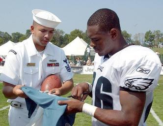 | Keywords: US Navy 050811-N-4729H-171 Storekeeper 1st Class Washington Jaramillo assigned to Navy Recruiting District Philadelphia gets an autograph from Philadelphia Eagles cornerback Lito Sheppard.jpg en Lehigh Pa Aug 11 2005 - Storekeeper 1st Class Washington Jaramillo assigned to Navy Recruiting District Philadelphia gets an autograph from Philadelphia Eagles cornerback Lito Sheppard during the team's training camp The team sponsored a Military Appreciation Day for area military members featuring breakfast bleacher seats to watch practice and an autograph session after the morning session More than a hundred Sailors Marines Airmen and Soldiers from Pennsylvania and New Jersey bases were invited to participate U S Navy photo by Chief Journalist Monica Halman RELEASED 2005-08-11 050811-N-4729H-171 Navy http //www navy mil/view_image asp id 27213 U S Navy photo by Chief Journalist Monica Halman PD-USGov-Military-Navy Images from US Navy location Lehigh Pa Storekeeper Military Appreciation Day Lito Sheppard |