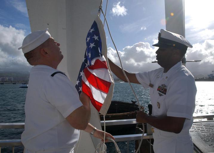 Keywords: US Navy 050907-N-5914D-002 Navy Counselor 1st Class Randy L. Schiller and Senior Chief Navy Counselor George A. Keels perform a ceremonial flag raising.jpg en Pearl Harbor Hawaii Sept 7 2005 - Navy Counselor 1st Class Randy L Schiller and Senior Chief Navy Counselor George A Keels both assigned to the amphibious assault ship USS Boxer LHD 4 perform a ceremonial flag raising during a visit to the USS Arizona Memorial in Pearl Harbor Hawaii Boxer which recently completed a series of exercises in the Western Pacific and Southeast Asian region is on her way back to her homeport of San Diego U S Navy photo by Airman Noel Danseco RELEASED 2005-09-07 050907-N-5914D-002 Navy http //www navy mil/view_image asp id 28056 U S Navy photo by Airman Noel Danseco PD-USGov-Military-Navy USS Arizona Memorial Navy Counselor Military people with a flag of the United States Flag hoisting |