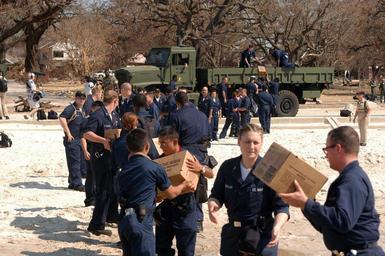 | Keywords: US Navy 050909-N-0793G-005 U.S. Navy Sailors assigned to the amphibious dock landing ship USS Whidbey Island (LSD 41) unload supplies brought ashore by a Landing Craft, Air Cushion (LCAC).jpg en Biloxi Miss Sept 9 2005 U S Navy Sailors assigned to the amphibious dock landing ship USS Whidbey Island LSD 41 unload supplies brought ashore by a Landing Craft Air Cushion LCAC in support of the Hurricane Katrina relief efforts Sailors are being brought to the beach to support the mission and are doing relief work such as distribution cleanup and restoration The Navy s involvement in the Hurricane Katrina humanitarian assistance operations is led by the Federal Emergency Management Agency FEMA in conjunction with the Department of Defense U S Navy photo by Journalist 3rd Class Chris Gethings RELEASED 2005-09-09 050909-N-0793G-005 Navy http //www navy mil/view_image asp id 28031 U S Navy photo by Journalist 3rd Class Chris Gethings PD-USGov-Military-Navy Images from US Navy location BILOXI Miss Hurricane Katrina aftermath in Biloxi Oshkosh MTVR |