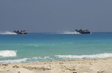| Keywords: US Navy 050913-N-9288T-121 Two Landing Craft Air Cushion (LCAC) carrying U.S. Marines assigned to the 13th Marine Expeditionary Unit and Expeditionary Strike Group One from the USS Tarawa (LHA 1) ride along.jpg en Mubarek Military City Egypt - Two Landing Craft Air Cushion LCAC carrying U S Marines assigned to the 13th Marine Expeditionary Unit and Expeditionary Strike Group One from the amphibious assault ship USS Tarawa LHA 1 ride along the beach during a rehearsal for a scheduled amphibious assault landing later in the week as part of Bright Star Bright Star is multinational exercise held every two years in Egypt This exercise is the largest and most significant coalition military exercise conducted by U S Central Command USCENTCOM 2005-09-13 050913-N-9288T-121 Navy http //www navy mil/view_image asp id 28233 U S Navy photo by Photographer's Mate 2nd Class Brandon A Teeples PD-USGov-Military-Navy Bright Star 2005 United States Navy in Mubarak Military City Aboard USS Tarawa LHA-1 Landing Craft Air Cushion |