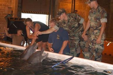 | Keywords: US Navy 050917-N-0793G-005 Rescued dolphins placed in a temporary saltwater pool facility at the Naval Construction Battalion Center Gulfport.jpg en Gulfport Miss Sept 17 2005 Ens Michael Dobling center takes part in feeding four dolphins with Institute for Marine Mammal Studies trainers The dolphins have been placed in a temporary saltwater pool facility at the Naval Construction Battalion Center Gulfport U S Navy Marine Mammal Program personnel from San Diego Calif provided the aboveground facility along with other necessary filtration equipment needed to care for sea mammals The four dolphins Kelly Noah Jackie and Toni spent the last two and a half weeks in the Gulf of Mexico swept out to sea by a wave reported to be forty feet high during Hurricane Katrina Because these dolphins are from a captive facility they do not forage for food or necessarily have the survival skills needed to avoid predators or boat traffic Since they were spotted off the gulf coast on Saturday Sept 10 Marine Life Aquarium trainers and National Oceanic Atmospheric Administration NOAA Fisheries Service biologists have been feeding the dolphins several times a day from a NOAA vessel U S Navy photo by Journalist 3rd Class Chris Gethings RELEASED 2005-09-17 050917-N-0793G-005 Navy http //www navy mil/view_image asp id 28296 U S Navy photo by Journalist 3rd Class Chris Gethings PD-USGov-Military-Navy Marine Life Oceanarium Naval Construction Battalion Center Gulfport Dolphin trainers people with dolphins United States Navy Marine Mammal Program Mammals of Mississippi |