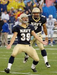 | Keywords: US Navy 051008-N-9693M-020 U.S. Naval Academy Midshipmen kicker Joey Bullen celebrates his game winning field goal with 4-10ths of a second left in the game against Air Force.jpg en Annapolis Md Oct 8 2005 - U S Naval Academy Midshipmen kicker Joey Bullen celebrates his game winning field goal with 4/10ths of a second left in the game against Air Force The field goal held by Brian Hampton 3 gave the Midshipmen the win over the Falcons 27-24 at Navy-Marine Corps Stadium The victory gives Navy 2-2 a good opportunity to retain the Commander-in-Chief's Trophy awarded to the team with the best record in games between the three major service academies Navy won it in 2003 and 2004 and will retain the trophy unless winless Army beats Air Force and Navy U S Navy photo by Damon J Moritz RELEASED 2005-10-08 051008-N-9693M-020 Navy http //www navy mil/view_image asp id 28776 U S Navy photo by Damon J Moritz PD-USGov-Military-Navy U S Naval Academy Midshipmen vs Air Force Falcons Oct 8 2005 Navy Midshipmen football players American football placekickers |