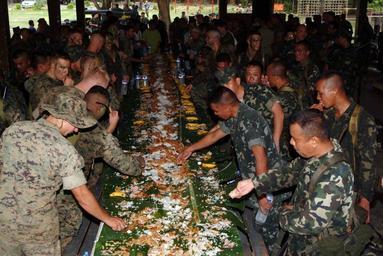 | Keywords: US Navy 051029-N-9222M-303 U.S Marines assigned to 31st Marine Expeditionary Unit (MEU) and Philippine Marines celebrate.jpg en Marine Base Ternate Philippines Oct 29 2005 U S Marines assigned to 31st Marine Expeditionary Unit MEU and Philippine Marines celebrate the successfully completion of Amphibious Landing Exercise PHIBLEX 2006 with a traditional Philippine military lunch called a boodle fight In a boodle fight traditional Filipino foods are served on top of banana leaves laid out on a series of long tables The participants then line up on both sides of the table and attack the food together with their bare hands enjoying the comradely and trust built during the exercise PHIBLEX is an annual bilateral Republic of the Philippines and United States exercise designed to improve interoperability increase readiness and continue professional relationships between the United States and Philippine Armed Forces U S Navy photo by Photographer s Mate 3rd Class Nicholas C Messina RELEASED 2005-10-29 051029-N-9222M-303 Navy http //www navy mil/view_image asp id 29500 U S Navy photo by Photographer s Mate 3rd Class Nicholas C Messina PD-USGov-Military-Navy Images from US Navy location Marine Base Ternate Philippines 31st Marine Expeditionary Unit Military of the Philippines |