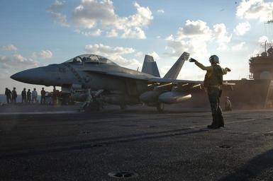 | Keywords: US Navy 051102-N-9389D-110 Flight deck personnel motion for an F-A-18F Super Hornet to prepare for launch.jpg en Pacific Ocean Nov 2 2005 - Flight deck personnel motion for an F/A-18F Super Hornet assigned to the Diamondbacks of Strike Fighter Squadron One Zero Two VFA-102 to prepare for launch from the flight deck of the conventionally powered aircraft carrier USS Kitty Hawk CV 63 U S Navy photo by Photographer's Mate Airman Benjamin Dennis RELEASED 2005-11-02 051102-N-9389D-110 Navy http //www navy mil/view_image asp id 29628 U S Navy photo by Photographer's Mate Airman Benjamin Dennis PD-USGov-Military-Navy Aboard USS Kitty Hawk CV-63 Photographs by Benjamin Dennis Strike Fighter Squadron 102 United States Navy |