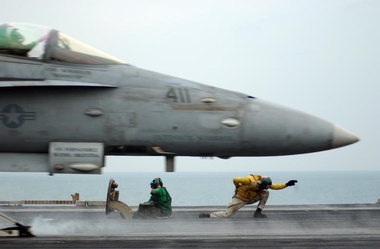 Keywords: US Navy 051115-N-6484E-008 A catapult shooter gives the signal to launch as an F-A-18C Hornet launches from the flight deck of the Nimitz-class aircraft carrier USS Theodore Roosevelt (CVN 71).jpg en Persian Gulf Nov 15 2005 - A catapult shooter gives the signal to launch as an F/A-18C Hornet assigned to the Golden Warriors of Strike Fighter Squadron Eight Seven VFA-87 launches from the flight deck of the Nimitz-class aircraft carrier USS Theodore Roosevelt CVN 71 Roosevelt and embarked Carrier Air Wing Eight CVW-8 are currently underway in the Persian Gulf supporting Operation Steel Curtain a joint U S -Iraqi military offensive aimed at preventing cells of Al Qaeda from entering Iraq through the Syrian border U S Navy photo by Photographer's Mate Airman Stephen Early RELEASED 2005-11-15 051115-N-6484E-008 Navy http //www navy mil/view_image asp id 30004 U S Navy photo by Photographer's Mate Airman Stephen Early PD-USGov-Military-Navy USS Theodore Roosevelt CVN-71 flight deck Strike Fighter Squadron 87 United States Navy |