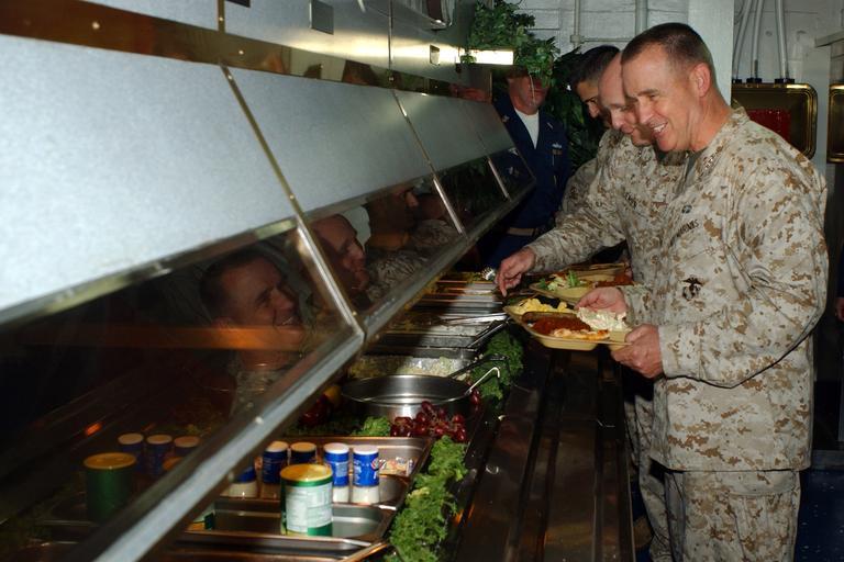 Keywords: US Navy 051115-N-9866B-403 Commanding General, 1st Marine Expeditionary Force, Lt. Gen. John F. Sattler and Commanding General, Expeditionary Strike Group Three (ESG-3), Brig. Gen. Carl Jensen, prepare to eat with Marines.jpg en Pacific Ocean Nov 15 2005 - Commanding General 1st Marine Expeditionary Force Lt Gen John F Sattler and Commanding General Expeditionary Strike Group Three ESG-3 Brig Gen Carl Jensen prepare to eat with Marines assigned to the 11th Marine Expeditionary Unit aboard the amphibious assault ship USS Peleliu LHA 5 Peleliu and ESG-3 are underway off the coast of Southern California conducting Composite Unit Training Exercise COMPTUEX in preparation for an upcoming scheduled deployment U S Navy photo by Journalist 2nd Class Zack Baddorf RELEASED 2005-11-15 051115-N-9866B-403 Navy http //www navy mil/view_image asp id 30378 U S Navy photo by Journalist 2nd Class Zack Baddorf PD-USGov-Military-Navy Aboard USS Peleliu LHA-5 John F Sattler |