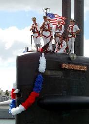 | Keywords: US Navy 051116-N-0879R-002 Crew members aboard the Los Angeles-class fast attack submarine USS Louisville (SSN 724) man the submarine^rsquo,s sail as they return to Naval Station Pearl Harbor, Hawaii.jpg en Pearl Harbor Hawaii Nov 16 2005 Crew members aboard the Los Angeles-class fast attack submarine USS Louisville SSN 724 man the submarine s sail as they return to Naval Station Pearl Harbor Hawaii Louisville is returning from a regularly scheduled six-month deployment to the Western Pacific While underway Louisville participated in exercise Talisman Saber off the coast of Australia and Ship Anti-Submarine Warfare Readiness and Evaluation Measurement SHAREM exercises with the Japan Maritime Self Defense Force U S Navy photo by Chief Journalist David Rush RELEASED 2005-11-16 051116-N-0879R-002 Navy http //www navy mil/view_image asp id 29962 U S Navy photo by Chief Journalist David Rush PD-USGov-Military-Navy USS Louisville SSN-724 at Pearl Harbor Submarine sails Ship nameplates |
