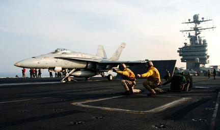 | Keywords: US Navy 051207-N-9362D-021 Catapult shooters signal to launch an F-A-18C Hornet, assigned to the Golden Warriors of Strike Fighter Squadron Eight Seven (VFA-87).jpg en Persian Gulf Dec 7 2005 Catapult shooters signal to launch an F/A-18C Hornet assigned to the Golden Warriors of Strike Fighter Squadron Eight Seven VFA-87 from the flight deck of the Nimitz-class aircraft carrier USS Theodore Roosevelt CVN 71 Roosevelt and embarked Carrier Air Wing Eight CVW-8 are currently underway on a regularly scheduled deployment conducting maritime security operations U S Navy photo by Photographer's Mate 3rd Class Randall Damm RELEASED 2005-12-07 051207-N-9362D-021 Navy http //www navy mil/view_image asp id 30573 U S Navy photo by Photographer's Mate 3rd Class Randall Damm PD-USGov-Military-Navy USS Theodore Roosevelt CVN-71 flight deck Strike Fighter Squadron 87 United States Navy |