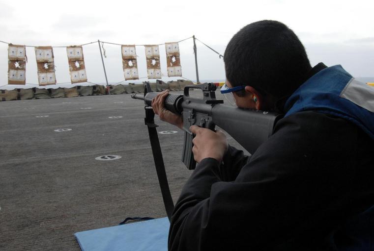 Keywords: US Navy 051213-N-3455P-002 irman Danrey White, fires an M-16 semi-automatic machine gun during weapons certifications aboard the amphibious assault ship USS Boxer (LHD 4).jpg en Pacific Ocean Dec 13 2005 - Airman Danrey White fires an M-16 semi-automatic machine gun during weapons certifications aboard the amphibious assault ship USS Boxer LHD 4 Boxer is currently at sea conducting shipboard training and flight deck qualifications U S Navy photo by Photographer's Mate Airman Paul Polach RELEASED 2005-12-13 051213-N-3455P-002 Navy http //www navy mil/view_image asp id 30801 U S Navy photo by Photographer's Mate Airman Paul Polach PD-USGov-Military-Navy Aboard USS Boxer LHD-4 Males with M16 rifle |