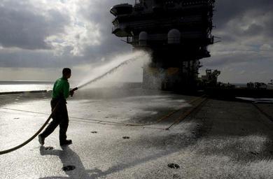 | Keywords: US Navy 051216-N-4776G-084 Airman Jonathan Castro uses a fire hose and sprays off the flight deck after flight operations aboard the Nimitz-class aircraft carrier USS Ronald Reagan (CVN 76).jpg en Pacific Ocean Dec 16 2005 - Airman Jonathan Castro uses a fire hose and sprays off the flight deck after flight operations aboard the Nimitz-class aircraft carrier USS Ronald Reagan CVN 76 Reagan just completed a nine-day Joint Task Force Exercise JTFEX which is the final step in preparing the Ronald Reagan Carrier Strike Group for deployment U S Navy photo by Photographer's Mate Airman Kathleen Gorby RELEASED 2005-12-16 051216-N-4776G-084 Navy http //www navy mil/view_image asp id 30789 U S Navy photo by Photographer's Mate Airman Kathleen Gorby PD-USGov-Military-Navy Flight deck maintenance aboard USS Ronald Reagan CVN-76 |