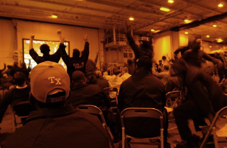| Keywords: US Navy 060104-N-7711S-030 Sailors stationed aboard USS Ronald Reagan (CVN 76) celebrate a touchdown during the Rose Bowl, which featured the University of Texas Longhorns against the University of Southern California Trojans.jpg en Pacific Ocean Jan 4 2006 - Sailors stationed aboard USS Ronald Reagan CVN 76 celebrate a touchdown during the Rose Bowl which featured the University of Texas Longhorns against the University of Southern California Trojans Texas defeated USC by a score of 41-38 to claim the 2005 NCAA College Football Championship More than 5 500 Sailors assigned to the Ronald Reagan Carrier Strike Group deployed in support of the global war on terrorism and maritime security operations This is the maiden deployment for the Navy's newest Nimitz-class nuclear powered aircraft carrier U S Navy photo by Photographer's Mate Airman Christine Singh RELEASED 2006-01-04 060104-N-7711S-030 Navy http //www navy mil/view_image asp id 30994 U S Navy photo by Photographer's Mate Airman Christine Singh PD-USGov-Military-Navy Aboard USS Ronald Reagan CVN-76 |