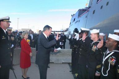 | Keywords: US Navy 060114-N-0191T-250 Sailors assigned to USS San Antonio (LPD 17) enjoy a rare honor, and receive the oath of enlistment by the 41st President of the United States, the Honorable George H.W. Bush.jpg en Ingleside Texas Jan 14 2006 Sailors assigned to USS San Antonio LPD 17 enjoy a rare honor and receive the oath of enlistment by the 41st President of the United States the Honorable George H W Bush following the ship s commissioning ceremony held on board Naval Station Ingleside As the first in her class USS San Antonio LPD 17 represents a key element of the Navy s seabase transformation Collectively San Antonio-class will functionally replace over 41 ships LPD 4 LSD 36 LKA 113 and LST 1179 classes of amphibious ships providing the Navy and Marine Corps with modern seabased platforms that are networked survivable and built to operate with 21st century transformational platforms such as the MV-22 Osprey the Expeditionary Fighting Vehicle EFV and future means by which Marines are delivered ashore U S Navy photo by Journalist 2nd Class Anthony C Tornetta RELEASED 2006-01-14 060114-N-0191T-250 Navy http //www navy mil/view_image asp id 31235 U S Navy photo by Journalist 2nd Class Anthony C Tornetta PD-USGov-Military-Navy Commissioning of USS San Antonio LPD-17 George H W Bush Oath of enlistment |