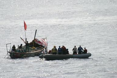 | Keywords: US Navy 060115-N-8637R-005 A rigid hull inflatable boat (RHIB) from the frigate USS Carr (FFG 52) assists a distressed vessel off the coast of Sierra Leone, Africa.jpg en Atlantic Ocean Jan 14 2006 - A rigid hull inflatable boat RHIB from the frigate USS Carr FFG 52 assists a distressed vessel off the coast of Sierra Leone Africa The vessel was spotted by lookouts from the 6th Fleet command and control ship USS Mount Whitney LCC/JCC 20 Both ships were heading for waters off the coast of Monrovia Liberia to help commemorate the inauguration of newly elected President Ellen Johnson Sirleaf on Jan 16 The small craft with a crew of 6 men had been at sea for 35 days and was without a working motor food or water Within two hours crew members dispatched from USS Carr had the vessel moving under its own power and had replenished supplies with enough food and fuel to get the vessel back to land safely U S Navy Photo RELEASED 2006-01-14 060115-N-8637R-005 Navy http //www navy mil/view_image asp id 31252 U S Navy photo PD-USGov-Military-Navy Rigid-hulled inflatable boats Ships in distress Aboard USS Mount Whitney LCC-20 |