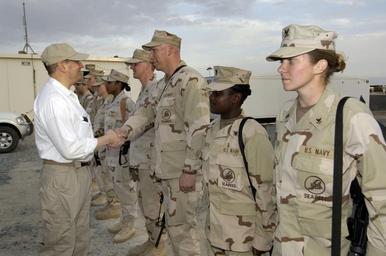 | Keywords: US Navy 060127-N-2568S-003 Secretary of the Navy (SECNAV) Dr. Donald C. Winter, meets with Sailors of the Year and Sailors of the Quarter from various units assigned throughout Kuwait.jpg en Ali Al Saleem Air Base Kuwait Jan 27 2006 - Secretary of the Navy SECNAV Dr Donald C Winter meets with Sailors of the Year and Sailors of the Quarter from various units assigned throughout Kuwait Dr Winter is in the Middle East to see first-hand the conditions morale and equipment in use by Navy and Marine Corps personnel deployed to the region U S Navy photo by Chief Journalist Craig P Strawser RELEASED 2006-01-27 060127-N-2568S-003 Navy http //www navy mil/view_image asp id 31552 U S Navy photo by Chief Journalist Craig P Strawser PD-USGov-Military-Navy Ali Al Salem Air Base Donald C Winter |