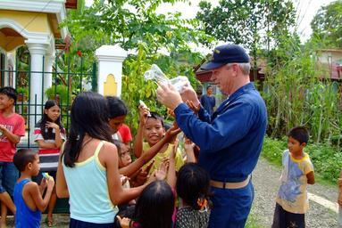 | Keywords: US Navy 060221-N-4772B-153 USS Harpers Ferry (LSD 49), Command Master Chief Darryl Brandt hands out candy to children in the small fishing village of Himbangen.jpg en Himbangan Philippines Feb 21 2006 - USS Harpers Ferry LSD 49 Command Master Chief Darryl Brandt hands out candy to children in the small fishing village of Himbangen Harpers Ferry and the amphibious assault ship USS Essex LHD 2 are providing humanitarian assistance to victims in the Saint Bernard Municipality where the town of Guinsahugon located in the southern part of the island was completely devastated during a Feb 17 landslide U S Navy photo by Journalist 2nd Class Brian P Biller RELEASED 2006-02-21 060221-N-4772B-153 Navy http //www navy mil/view_image asp id 32136 U S Navy photo by Journalist 2nd Class Brian P Biller PD-USGov-Military-Navy Images from US Navy location Himbangan Philippines Aboard USS Harpers Ferry LSD-49 People handing out candy |