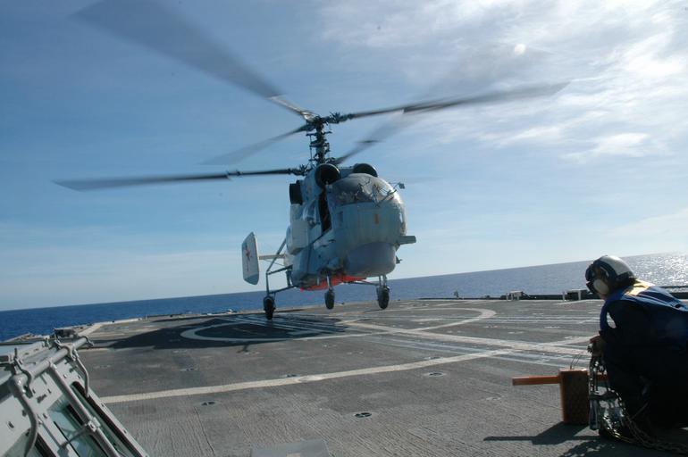 | Keywords: US Navy 060331-N-7293M-385 A Sailor crouches to avoid the rotor wash of a Russian Navy KA-27 Helix helicopter as it lifts off from the flight deck of the Ticonderoga-class guided missile cruiser USS Cowpens (CG 63).jpg en Yellow Sea March 31 2006 - A Sailor crouches to avoid the rotor wash of a Russian Navy KA-27 Helix helicopter as it lifts off from the flight deck of the Ticonderoga-class guided missile cruiser USS Cowpens CG 63 during a joint U S -Russian naval exercise The Russian Federation Navy made the first visit of a Russian Navy vessel to the U S territory of Guam in order to participate in a joint humanitarian assistance and disaster relief exercise U S Navy photo by Photographer's Mate 2nd Class Nathanael T Miller RELEASED 2006-03-31 060331-N-7293M-385 Navy http //www navy mil/view_image asp id 33247 U S Navy photo by Photographer's Mate 2nd Class Nathanael T Miller PD-USGov-Military-Navy Aboard USS Cowpens CG-63 Kamov Ka-27 |