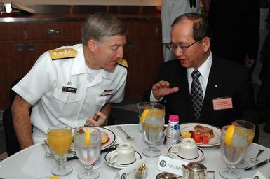 | Keywords: US Navy 060417-N-9723W-028 Rear Adm. Jamie Kelly, left, and Japanese Delegate Yuji Sugiyama engage in conversation before having breakfast aboard the Nimitz-class aircraft carrier USS John C. Stennis (CVN 74).jpg en North Island Calif April 17 2006 - Rear Adm Jamie Kelly left and Japanese Delegate Yuji Sugiyama engage in conversation before having breakfast aboard the Nimitz-class aircraft carrier USS John C Stennis CVN 74 Sugiyama s visit was to help aide in the transition stationing a U S nuclear-powered aircraft carrier in Japan Stennis is currently in port Naval Air Station NAS North Island conducting the ship s five-year Inspection and Survey INSURV U S Navy photo By Airman Alan Willis RELEASED 2006-04-17 060417-N-9723W-028 Navy http //www navy mil/view_image asp id 33709 U S Navy photo By Airman Alan Willis PD-USGov-Military-Navy International guests at Naval Air Station North Island Guests aboard USS John C Stennis CVN-74 James D Kelly |