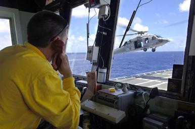 | Keywords: US Navy 060514-N-6501M-002 Aviation Boatswain's Mate Handler 2nd Class Zachary L. Dabney monitors the arrival of an MH-60S Seahawk helicopter assigned to the Sea Combat Squadron Two five (HSC-25).jpg en Pacific Ocean May 14 2006 - Aviation Boatswain's Mate Handler 2nd Class Zachary L Dabney monitors the arrival of an MH-60S Seahawk helicopter assigned to the Sea Combat Squadron Two five HSC-25 on the flight deck of the Military Sealift Command MSC hospital ship USNS Mercy T-AH 19 As the ship's Air Boss Dabney will monitor all flight operations conducted on Mercy during its five-month deployment to South Asia Southeast Asia and the Pacific Islands The medical crew aboard Mercy will provide general and ophthalmology surgery basic medical evaluation and treatment preventive medicine treatment dental screenings and treatment optometry screenings eyewear distribution public health training and veterinary services as requested by the host nations Mercy is uniquely capable of supporting medical and humanitarian assistance needs and is configured with special medical equipment and a robust multi-specialized medical team who can provide a range of services ashore as well as aboard the ship The medical staff is augmented with an assistance crew many of whom are part of non-governmental organizations which have significant medical capabilities U S Navy photo by Chief Photographer's Mate Edward G Martens RELEASED 2006-05-14 060514-N-6501M-002 Navy http //www navy mil/view_image asp id 34579 U S Navy photo by Chief Photographer's Mate Edward G Martens PD-USGov-Military-Navy Aviation Boatswain's Mates Handlers MH-60S Seahawk Aboard USNS Mercy T-AH-19 Helicopter Sea Combat Squadron 25 United States Navy |