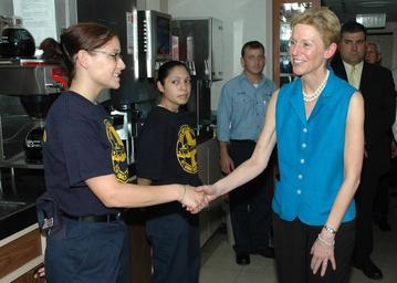 | Keywords: US Navy 060523-N-1577S-051 USNS Mercy Humanitarian Deployment to South East Asia.jpg en Manila Philippines May 23 2006 - U S Ambassador to the Republic of the Philippines Kristie A Kenney thanks food service attendant Aviation Ordnanceman Airman Carrie Neal for her work aboard the Military Sealift Command MSC hospital ship USNS Mercy T-AH 19 during a scheduled port visit in Manila Mercy is on a five-month deployment during which it will visit areas of South Asia Southeast Asia and the Pacific Islands where its crew and several health and civic related organizations will work together to aid in humanitarian and civic efforts Mercy is uniquely capable of supporting medical and humanitarian assistance needs and has been configured with special medical equipment and a robust multi-specialized medical team to provide a range of services ashore as well as aboard ship The medical staff is augmented with assistance crews many of whom are part of non-governmental organizations and have significant medical capabilities U S Navy photo by PhotographerUs Mate 3rd Class Timothy F Sosa RELEASED 060523-N-1577S-051 Navy http //www navy mil/view_image asp id 34861 U S Navy photo by PhotographerUs Mate 3rd Class Timothy F Sosa PD-USGov-Military-Navy Kristie Kenney Aboard USNS Mercy T-AH-19 |