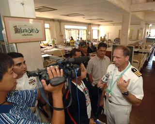| Keywords: US Navy 060526-N-6501M-029 Captain Joseph L. Moore, commanding officer, Medical Training Facility, aboard the Military Sealift Command (MSC) hospital ship, USNS Mercy (T-AH 19), is interviewed local television media.jpg en Zamboanga Republic of the Philippines May 26 2006 Captain Joseph L Moore commanding officer Medical Training Facility aboard the Military Sealift Command MSC hospital ship USNS Mercy T-AH 19 is interviewed local television media during a tour of the Zamboanga Medical Center accompanied by city officials For the next several days the ship will be anchored offshore conducting humanitarian and civic assistance in the local area Mercy is on a five-month deployment to South Asia Southeast Asia and the Pacific Islands Mercy s medical crew will provide general and ophthalmology surgery basic medical evaluation and treatment preventive medicine treatment dental screenings and treatment optometry screenings eyewear distribution public health training and veterinary services as requested by the host nations Mercy is uniquely capable of supporting medical and humanitarian assistance needs and is configured with special medical equipment and a robust multi-specialized medical team that can provide a range of services ashore as well as aboard the ship The medical staff is augmented with an assistance crew many of whom are part of non-governmental organizations that have significant medical capabilities U S Navy photo by Chief Photographer's Mate Edward G Martens RELEASED 2006-05-26 060526-N-6501M-029 Navy http //www navy mil/view_image asp id 35054 U S Navy photo by Chief Photographer's Mate Edward G Martens PD-USGov-Military-Navy United States Navy in Zamboanga City Aboard USNS Mercy T-AH-19 |