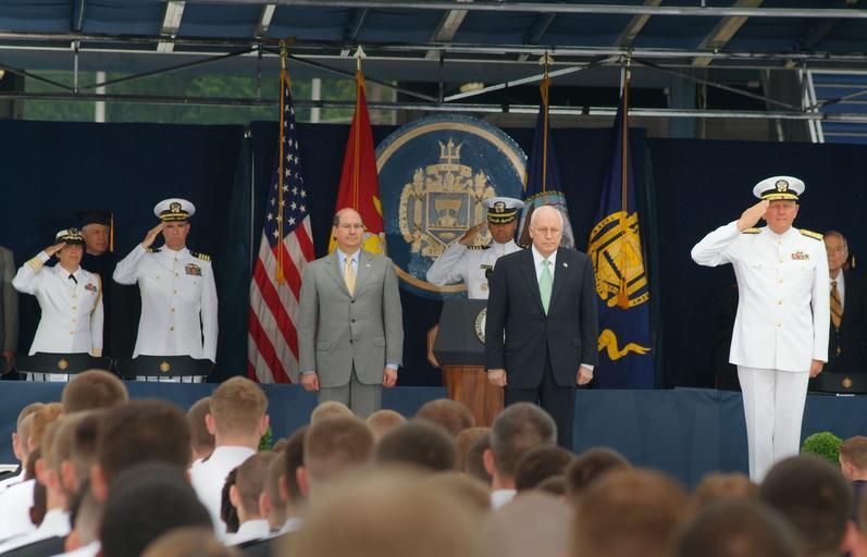 | Keywords: US Navy 060526-N-2383B-025 RELEASED - PHC Johnny Bivera, N00PH, CNO PAO Credit as U.S. Navy photo by Johnny Bivera.jpg en Annapolis Md May 26 2006 - Vice President Dick Cheney center right Secretary of the Navy SECNAV Dr Donald C Winter center left and U S Naval Academy Superintendent Vice Adm Rodney P Rempt far right render honors during the playing of the national anthem at the U S Naval Academy's Graduation and Commissioning Ceremony 2006 By the conclusion of the ceremony nine hundred-eighty Midshipmen were commissioned as Navy Ensigns or Marine Corps Second Lieutenants The Chief of Naval Operations CNO Adm Mike Mullen and Assistant Commandant of the Marine Corp Gen Robert Magnus administered the Oath of Office at the 156th traditional graduation ceremony U S Navy photo by Chief Photographer's Mate Johnny Bivera RELEASED 060526-N-2383B-025 Navy http //www navy mil/view_image asp id 35072 U S Navy photo by Chief Photographer's Mate Johnny Bivera PD-USGov-Military-Navy Rodney P Rempt Dick Cheney in 2006 Donald C Winter Michael G Mullen in 2006 Graduation and Commissioning Ceremony May 26 2006 Taken with Fujifilm FinePix S3 Pro Robert Magnus Salutes |