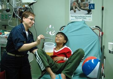 | Keywords: US Navy 060527-N-3532C-041 USNS Mercy - Deployment 2006.jpg en Zamboanga Republic of the Philippines May 27 2006 - Navy Lt Stella Annunziato a casualty receiving staff nurse from Brownsmills N J entertains a patient while he waits in the casualty receiving department aboard U S Naval hospital ship Mercy T-AH 19 anchored off the city of Zamboanga For the next several days the ship will be conducting humanitarian and civic assistance in the local area Mercy is on a five-month deployment to South Asia Southeast Asia and the Pacific Islands MercyUs medical crew will provide general and ophthalmology surgery basic medical evaluation and treatment preventive medicine treatment dental screenings and treatment optometry screenings eyewear distribution public health training and veterinary services as requested by the host nations Mercy is uniquely capable of supporting medical and humanitarian assistance needs and is configured with special medical equipment and a robust multi-specialized medical team that can provide a range of services ashore as well as aboard the ship The medical staff is augmented with an assistance crew many of whom are part of non-governmental organizations that have significant medical capabilities U S Navy photo by Journalist Seaman Joseph Caballero RELEASED 060527-N-3532C-041 Navy http //www navy mil/view_image asp id 35111 U S Navy photo by Journalist Seaman Joseph Caballero PD-USGov-Military-Navy United States Navy in Zamboanga City Aboard USNS Mercy T-AH-19 Bubbles |