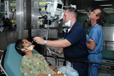 | Keywords: US Navy 060529-N-3931M-003 Navy Hospital Corpsman John Hensley takes a patient's temperature.jpg en Zamboanga Republic of the Philippines May 29 2006 Navy Hospital Corpsman John Hensley takes a patient's temperature while Michael Foster a registered nurse from Project HOPE Health Opportunities for People Everywhere monitors other vital information prior to receiving medical attention aboard the U S Military Sealift Command MSC hospital ship USNS Mercy T-AH 19 anchored off the coast on a scheduled humanitarian visit Project HOPE s mission is to achieve sustainable advances in health care around the world by implementing health education programs conducting health policy research and providing humanitarian assistance in areas of need Mercy is on a five-month deployment during which it will visit areas of South Asia Southeast Asia and the Pacific Islands where its crew and several health and civic related organizations will work together to aid in humanitarian and civic efforts Like all US Naval forces Mercy is able to rapidly respond to a range of situations on short notice Mercy is uniquely capable of supporting medical and humanitarian assistance needs and has been configured with special medical equipment and a robust multi-specialized medical team to provide a range of services ashore as well as on board the ship The medical staff is augmented with assistance crews many of whom are part of non-governmental organizations and have significant medical capabilities U S Navy photo by Photographer s Mate 1st Class Michael R McCormick RELEASED 2006-05-29 060529-N-3931M-003 Navy http //www navy mil/view_image asp id 35156 U S Navy photo by Photographer s Mate 1st Class Michael R McCormick PD-USGov-Military-Navy United States Navy in Zamboanga City Hospital Corpsman Aboard USNS Mercy T-AH-19 |