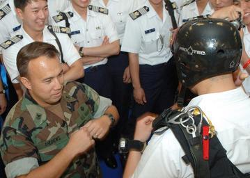 | Keywords: US Navy 060530-N-9662L-080 Petty Officer 1st Class Tony Andrews, a Navy parachutist assigned to Naval Special Warfare Unit One (NSWU-1), explains the functions of a MT1X free fall parachute.jpg en Santa Rita Guam May 30 2005 - Petty Officer 1st Class Tony Andrews a Navy parachutist assigned to Naval Special Warfare Unit One NSWU-1 explains the functions of a MT1X free fall parachute and it's components to officers and cadets from the Republic of Korea Air Force ROKAF Academy during a static display at the NSWU-1 compound Maj Gen Bu Jung Bae Vice Superintendent ROKAF Academy and his staff toured military instillations on Guam and historical sites in the region U S Navy photo by Photographer's Mate 2nd Class John F Looney RELEASED 2005-05-30 060530-N-9662L-080 Navy http //www navy mil/view_image asp id 35445 U S Navy photo by Photographer's Mate 2nd Class John F Looney PD-USGov-Military-Navy Naval Base Guam Republic of Korea Air Force Naval Special Warfare Unit One |