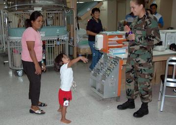 | Keywords: US Navy 060531-N-9076B-055 Air Force Senior Airman Danielle Fahlbush of Harrisburg, Pa., entertains a little girl in the recovery ward.jpg en Zamboanga Philippines May 31 2006 - Air Force Senior Airman Danielle Fahlbush of Harrisburg Pa entertains a little girl in the recovery ward aboard the U S Military Sealift Command MSC hospital ship USNS Mercy T-AH 19 Mercy's one week stay in Zamboanga will provide a multitude of medical dental and veterinary care for the people who live in this region This care is provided by a portion of Mercy's staff working side by side with their Filipino counterparts at several medical centers in the city as well as patients being given care on the ship itself Mercy's stop in Zamboanga is the first of many during its humanitarian deployment to South and Southeast Asia and the Pacific Islands Mercy is able to rapidly respond to a range of situations on short notice and is capable of supporting medical and humanitarian assistance needs with special medical equipment and a multi-specialized medical team providing a range of services ashore as well as aboard the ship The medical staff is augmented with an assistance crew many of whom are part of non-governmental organizations that have significant medical capabilities U S Navy photo by Chief Photographer's Mate Don Bray RELEASED 2006-05-31 060531-N-9076B-055 Navy http //www navy mil/view_image asp id 35316 U S Navy photo by Chief Photographer's Mate Don Bray PD-USGov-Military-Navy United States Navy in Zamboanga City Aboard USNS Mercy T-AH-19 |