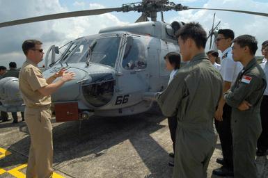 | Keywords: US Navy 060601-N-4205W-004 Officer in Charge Anti-Submarine Squadron Light Three Seven (HSL-37) Detachment 5, Lt. Cmdr. Colin Smith, explains the capabilities of the SH-60B Seahawk helicopter.jpg en Singapore June 1 2006 - Officer in Charge Anti-Submarine Squadron Light Three Seven HSL-37 Detachment 5 Lt Cmdr Colin Smith explains the capabilities of the SH-60B Seahawk helicopter to a group of Republic of Singapore Air Force and Navy personnel during a professional exchange as part of the Singapore phase of exercise Cooperation Afloat Readiness and Training CARAT CARAT is an annual series of bilateral maritime training exercises between the United States and six Southeast Asia nations designed to build relationships and enhance the operational readiness of the participating forces U S Navy photo by Mass Communication Specialist 1st Class Kathryn Whittenberger RELEASED 2006-06-01 060601-N-4205W-004 Navy http //www navy mil/view_image asp id 35360 U S Navy photo by Mass Communication Specialist 1st Class Kathryn Whittenberger PD-USGov-Military-Navy Naval ships of the United States in Singapore Cooperation Afloat Readiness and Training 2006 |