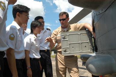 | Keywords: US Navy 060601-N-4205W-008 Officer in Charge Anti-Submarine Squadron Light Three Seven (HSL-37) Detachment 5, Lt. Cmdr. Colin Smith, explains the capabilities of the SH-60B Seahawk helicopter.jpg en Singapore June 1 2006 - Officer in Charge Anti-Submarine Squadron Light Three Seven HSL-37 Detachment 5 Lt Cmdr Colin Smith explains the capabilities of the SH-60B Seahawk helicopter to a group of Republic of Singapore Air Force and Navy personnel during a professional exchange as part of the Singapore phase of exercise Cooperation Afloat Readiness and Training CARAT CARAT is an annual series of bilateral maritime training exercises between the United States and six Southeast Asia nations designed to build relationships and enhance the operational readiness of the participating forces U S Navy photo by Mass Communication Specialist 1st Class Kathryn Whittenberger RELEASED 2006-06-01 060601-N-4205W-008 Navy http //www navy mil/view_image asp id 35361 U S Navy photo by Mass Communication Specialist 1st Class Kathryn Whittenberger PD-USGov-Military-Navy Naval ships of the United States in Singapore Cooperation Afloat Readiness and Training 2006 |