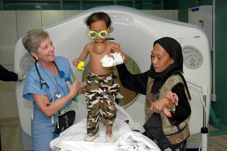 | Keywords: US Navy 060604-N-2832L-048 Diane Speranza, a Project Hope volunteer and emergency room nurse assigned to casualty receiving, prepares a boy on his fifth birthday for doctors.jpg en Jolo Philippines June 4 2006 - Diane Speranza a Project Hope volunteer and emergency room nurse assigned to casualty receiving prepares a boy on his fifth birthday for doctors to tend to his anterior chest wall mass The boy and his mother arrived by helicopter for a stint aboard Mercy so its medical staff can take care of the boy and other Jolo families Jolo is U S Military Sealift Command MSC Hospital ship USNS Mercy s T-AH 19 second stop during the ship s scheduled five-month humanitarian aid mission to host nations in the Pacific Islands and south and Southeast Asia Mercy has already visited Zamboanga Philippines where its crew has treated several thousand patients in one week Helicopter Sea Combat Squadron Two Five HSC-25 is attached to Mercy and will provide medical evacuation for patients as well as a mode of transportation for medical personnel to reach the shore Mercy is uniquely capable of supporting medical and humanitarian assistance needs and is configured with special medical equipment and a robust multi-specialized medical team who can provide a range of services ashore as well as aboard the ship The medical staff is augmented with an assistance crew many of whom are part of nongovernmental organizations foreign militaries and other branches of U S military that have significant medical capabilities U S Navy photo by Journalist Seaman Apprentice Mike Leporati RELEASED 2006-06-04 060604-N-2832L-048 Navy http //www navy mil/view_image asp id 35439 U S Navy photo by Journalist Seaman Apprentice Mike Leporati PD-USGov-Military-Navy Images from US Navy location Jolo Philippines Aboard USNS Mercy T-AH-19 Helicopter Sea Combat Squadron 25 United States Navy |