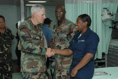 | Keywords: US Navy 060605-N-1577S-010 Commander, U.S. Pacific Command, and Adm. William J. Fallon thanks Hospitalman Laneice Wright for her hard work during a tour of U.S. Military Sealift Command (MSC) Hospital ship USNS Mercy (T-AH 19).jpg en Jolo Philippines June 5 2006 - Commander U S Pacific Command and Adm William J Fallon thanks Hospitalman Laneice Wright for her hard work during a tour of U S Military Sealift Command MSC Hospital ship USNS Mercy T-AH 19 Mercy is on a five-month deployment to South Asia Southeast Asia and the Pacific Islands The medical crew aboard Mercy will provide general and ophthalmology surgery basic medical evaluation and treatment preventive medicine treatment dental screenings and treatment optometry screenings eyewear distribution public health training and veterinary services as requested by the host nations Like all U S Naval forces Mercy is able to rapidly respond to a range of situations on short notice Mercy is uniquely capable of supporting medical and humanitarian assistance needs and is configured with special medical equipment and a robust multi-specialized medical team who can provide a range of services ashore as well as aboard the ship The medical staff is augmented with an assistance crew many of whom are part of non-governmental organizations which have significant medical capabilities U S Navy photo by Photographer's Mate 3rd Class Timothy F Sosa RELEASED 2006-06-05 060605-N-1577S-010 Navy http //www navy mil/view_image asp id 35457 U S Navy photo by Photographer's Mate 3rd Class Timothy F Sosa PD-USGov-Military-Navy Images from US Navy location Jolo Philippines Aboard USNS Mercy T-AH-19 |