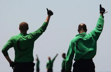 | Keywords: US Navy 060607-N-5549O-203 Aviation Boatswain's Mates signal a no-load launch of catapult two on the flight deck prior to flight quarters aboard the Nimitz-class aircraft carrier USS Ronald Reagan (CVN 76).jpg en Pacific Ocean June 7 2006 - Aviation Boatswain's Mates signal a no-load launch of catapult two on the flight deck prior to flight quarters aboard the Nimitz-class aircraft carrier USS Ronald Reagan CVN 76 Reagan and embarked Carrier Air Wing One Four CVW-14 are currently on a regularly scheduled deployment in support of the global war on terrorism as well as conducting Maritime Security Operations MSO in the region U S Navy photo by Photographer's Mate 3rd Class Kevin S O'Brien RELEASED 2006-06-07 060607-N-5549O-203 Navy http //www navy mil/view_image asp id 35553 U S Navy photo by Photographer's Mate 3rd Class Kevin S O'Brien PD-USGov-Military-Navy Aviation Boatswain's Mates Equipment Aboard USS Ronald Reagan CVN-76 Multiple people with thumbs up |
