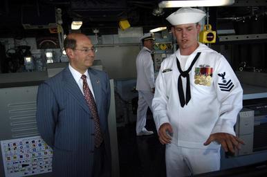 | Keywords: US Navy 060610-N-3642E-005 Quartermaster 1st Class Joshua Manuel gives Secretary of the Navy (SECNAV) the Honorable Dr. Donald C. Winter a tour of the bridge.jpg en Mayport Fla June 10 2006 - Quartermaster 1st Class Joshua Manuel gives Secretary of the Navy SECNAV the Honorable Dr Donald C Winter a tour of the bridge aboard the newest Arleigh Burke-class guided missile destroyer USS Farragut DDG 99 The ship's name honors Adm David Glasgow Farragut In 1864 Farragut rallied his men to victory shouting Damn the torpedoes Full speed ahead Farragut led his naval forces on to win the Battle of Mobile Bay U S Navy photo by Photographer s Mate 1st Class Shawn P Eklund RELEASED 2006-06-10 060610-N-3642E-005 Navy http //www navy mil/view_image asp id 35653 U S Navy photo by Photographer s Mate 1st Class Shawn P Eklund PD-USGov-Military-Navy Naval Station Mayport USS Farragut DDG-99 Quartermaster United States Navy Donald C Winter |