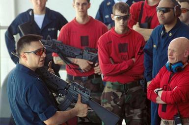 | Keywords: US Navy 060612-N-3946H-065 Gunner's Mate 1st Class Walton Ciferri discusses proper procedures for loading and firing an M-203 grenade launcher, during a training exercise.jpg en Pacific Ocean June 12 2006 - Gunner's Mate 1st Class Walton Ciferri discusses proper procedures for loading and firing an M-203 grenade launcher during a training exercise on the fantail aboard the conventionally-powered aircraft carrier USS Kitty Hawk CV 63 Currently under way in the 7th Fleet area of responsibility AOR Kitty Hawk demonstrates power projection and sea control as the U S Navy's only permanently forward-deployed aircraft carrier operating from Yokosuka Japan U S Navy photo by Photographer's Mate Airman Patrick L Heil RELEASED 2006-06-12 060612-N-3946H-065 Navy http //www navy mil/view_image asp id 35746 U S Navy photo by Photographer's Mate Airman Patrick L Heil PD-USGov-Military-Navy M16 rifle with M203 Males with M203 Aboard USS Kitty Hawk CV-63 Gunner's Mate |